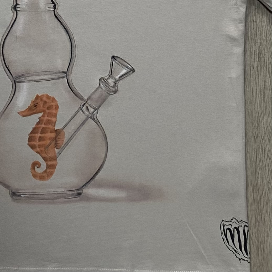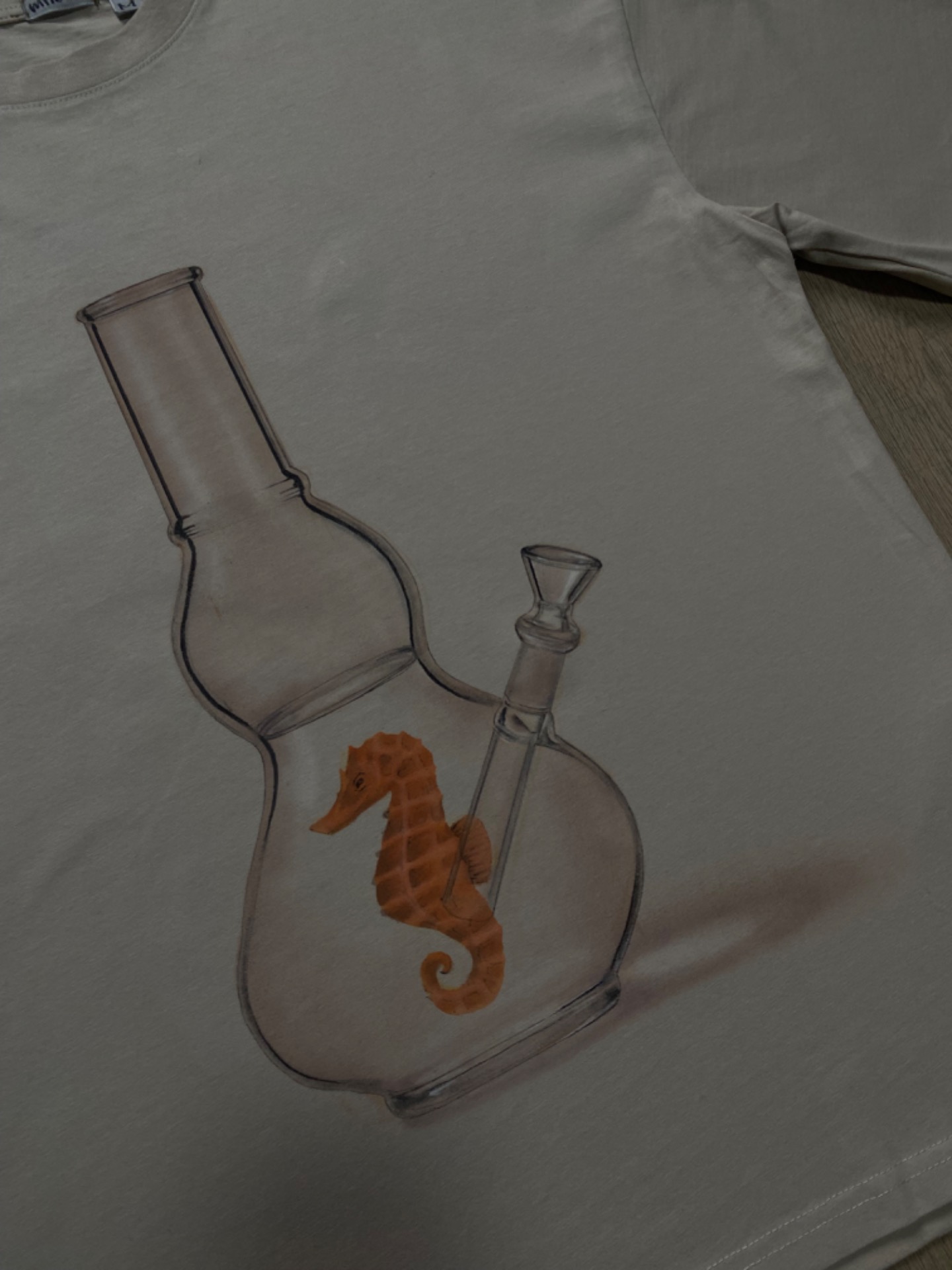 Fish in a B0ng TEE Beige&Orange je tričko, celé ručně pomalované airbrushem, s oranžovým mořským koníkem na světle béžovém pozadí.