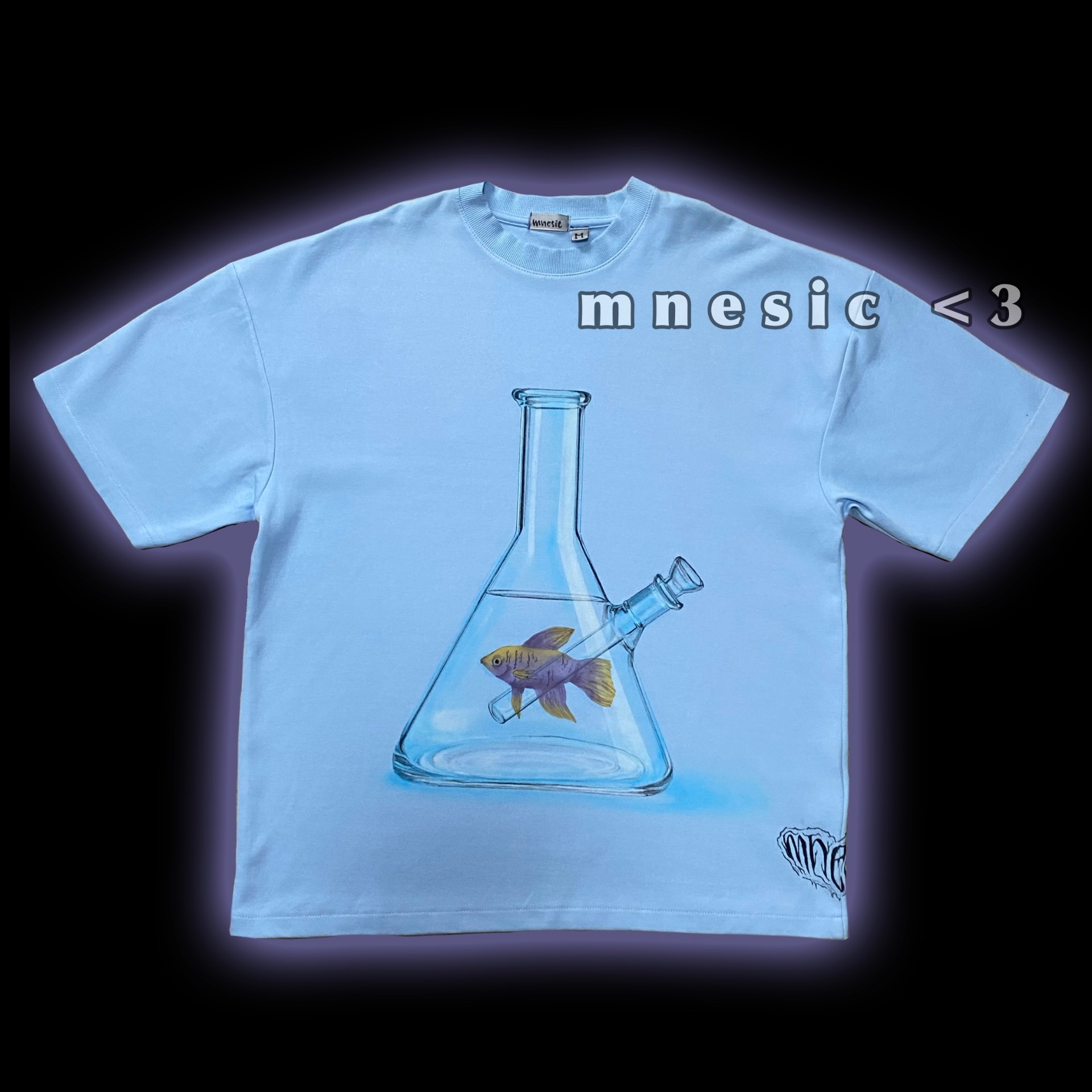 Fish in a B0ng TEE Blue&Purple je tričko, celé ručně pomalované airbrushem, s fialovo-žlutou rybkou na světle modrém pozadí.