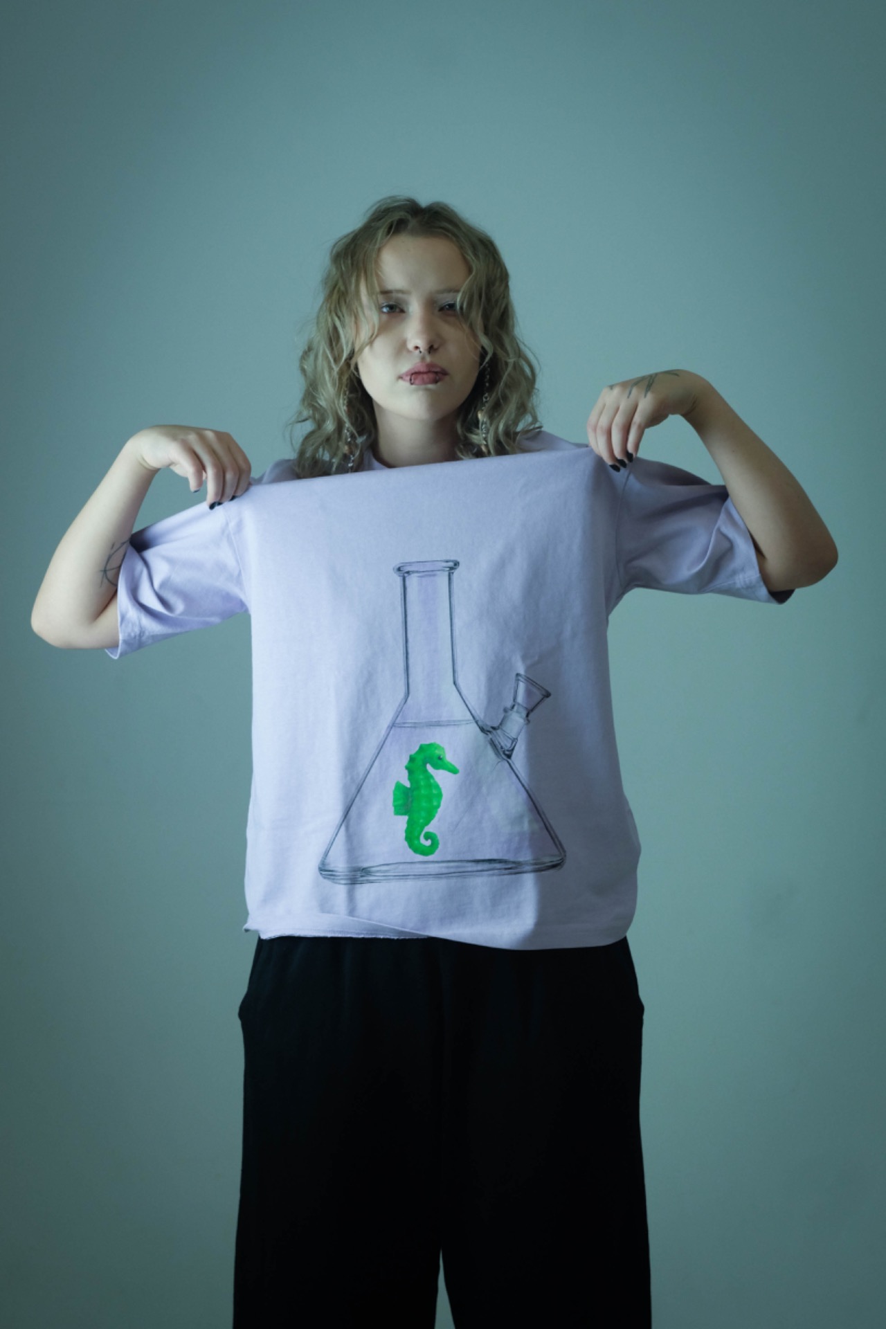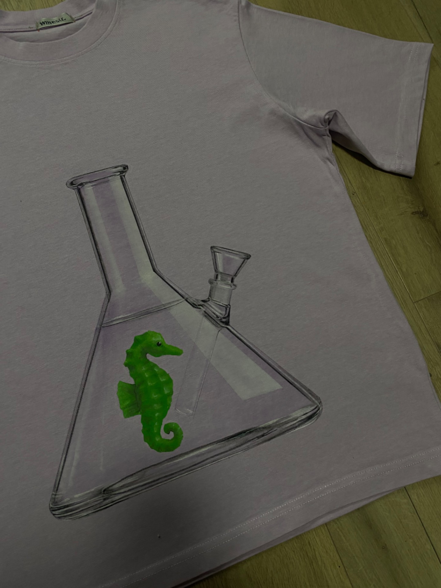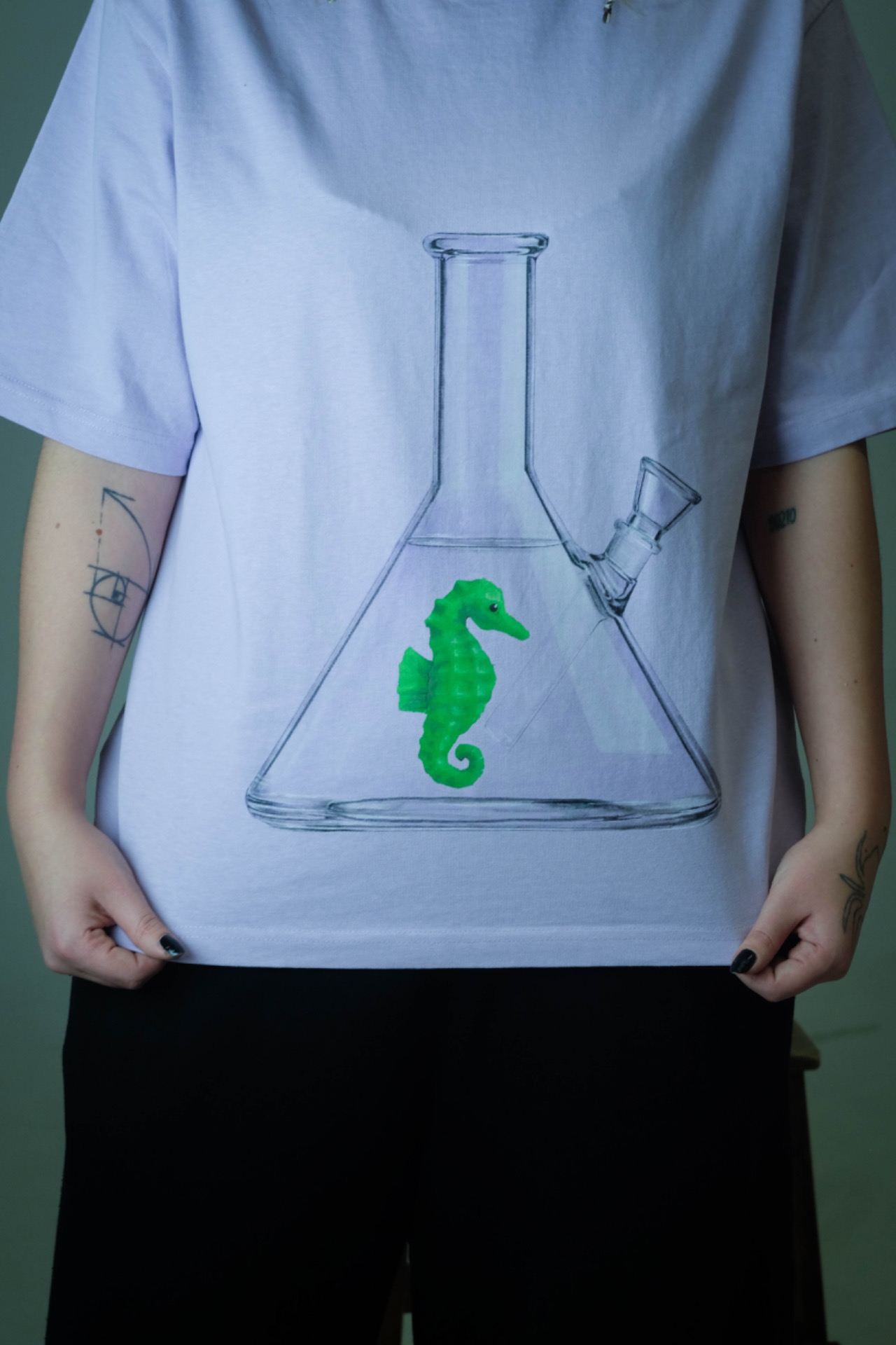 Fish in a B0ng TEE Purple&Green je tričko, celé ručně pomalované airbrushem, se zeleným mořským koníkem na světle fialovém pozadí.