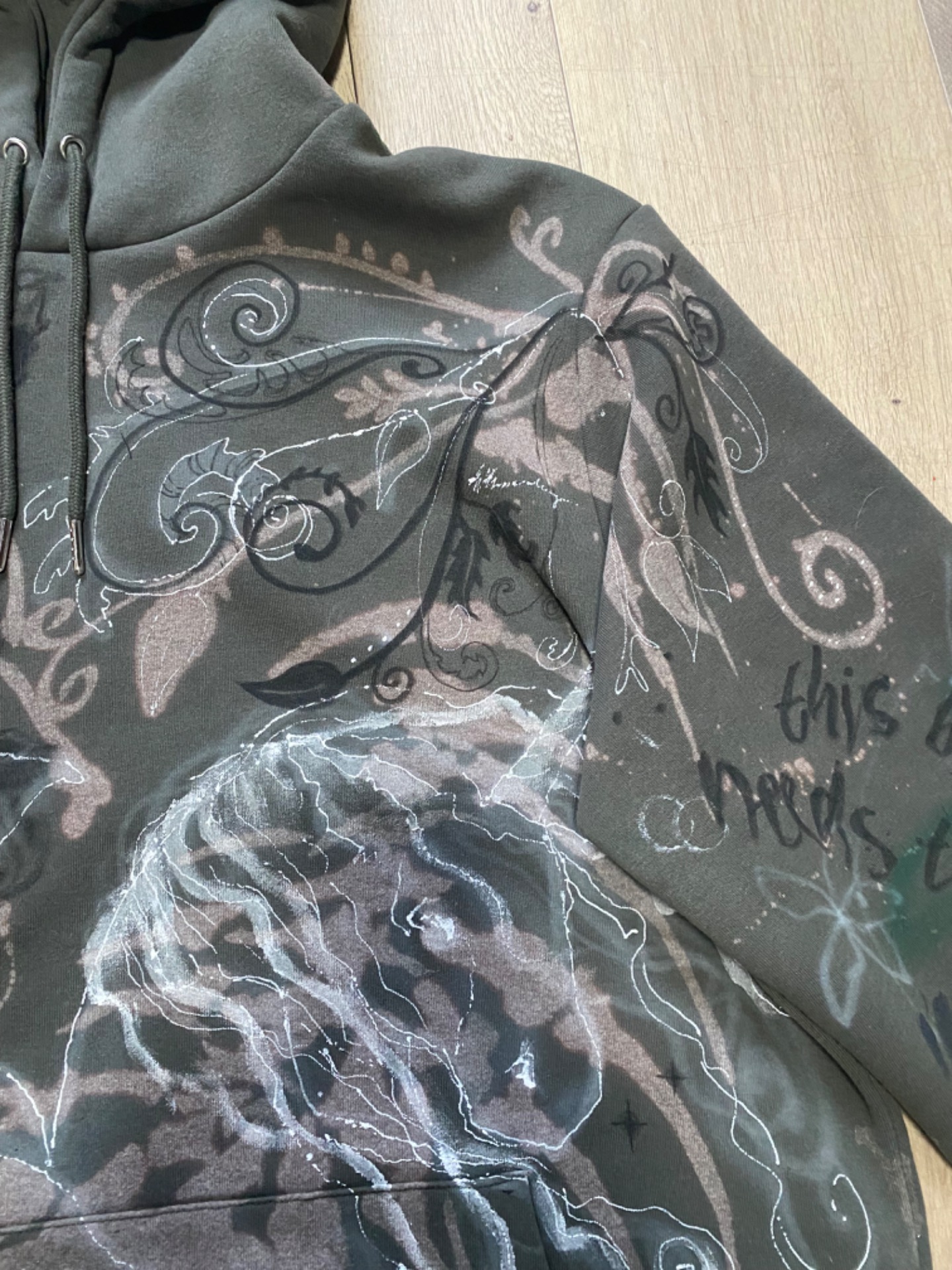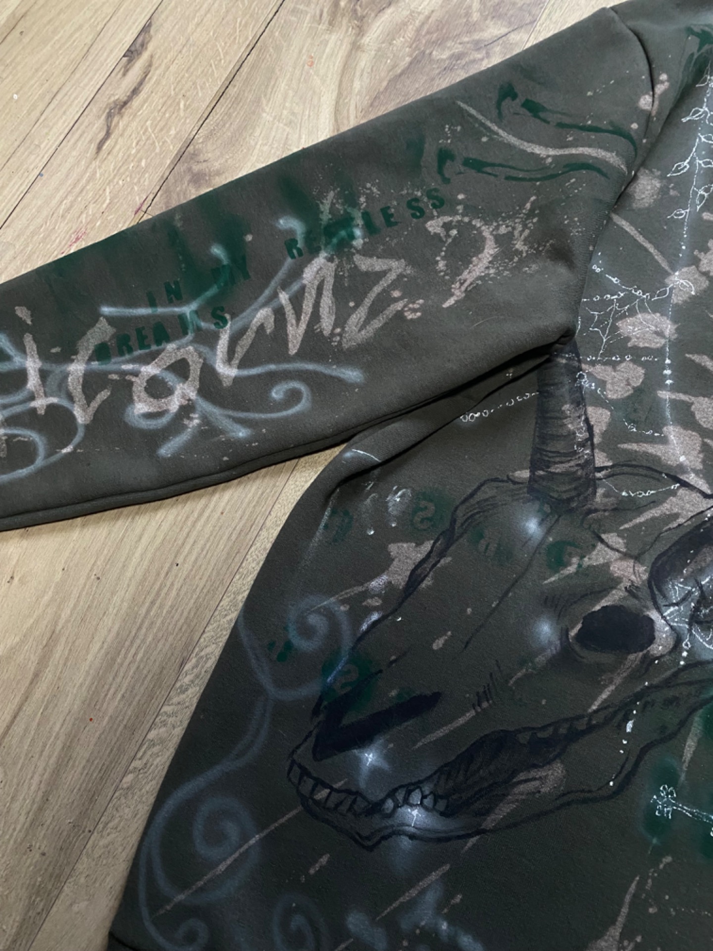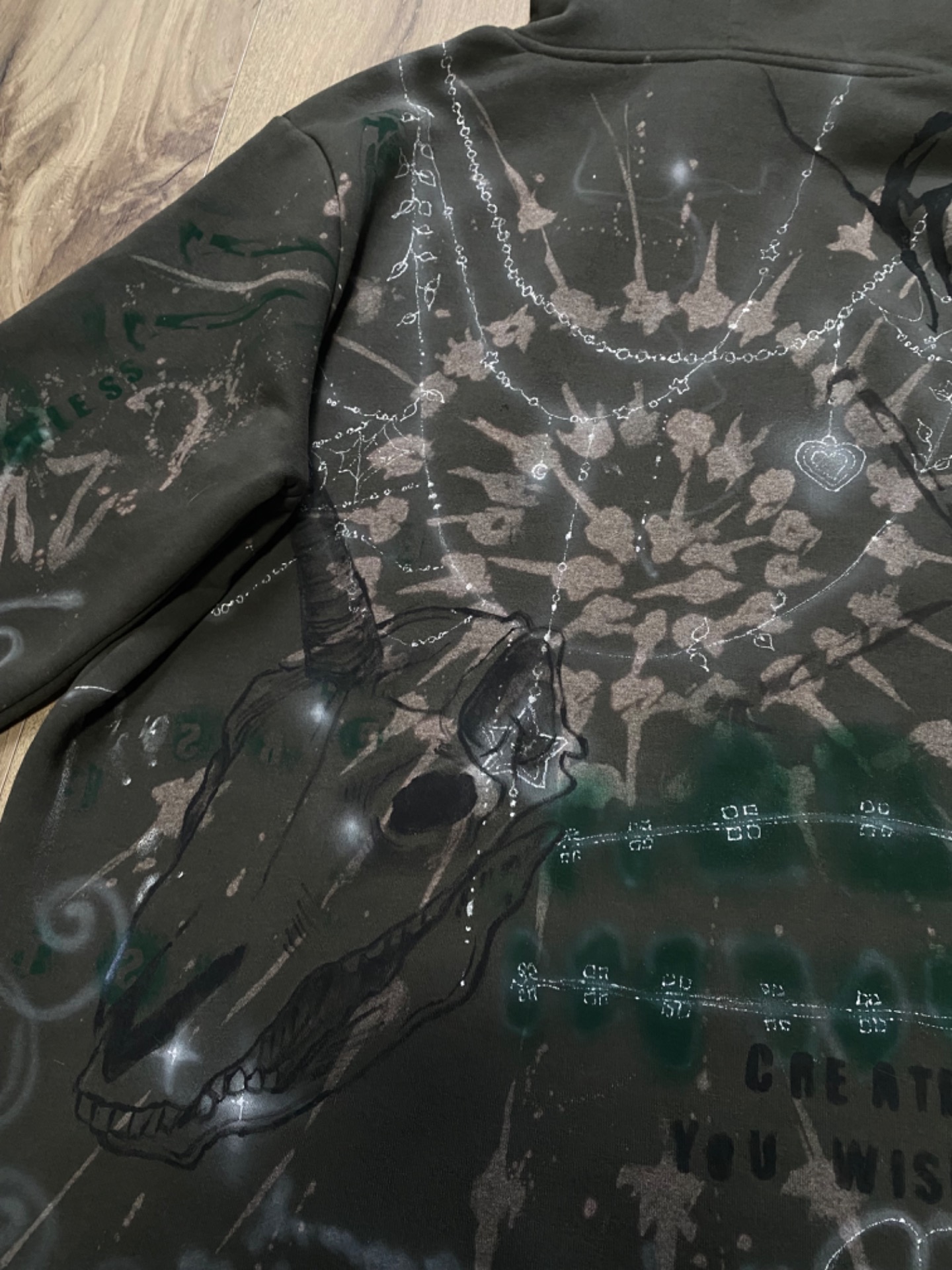 Unicornz Hoodie je celá ručně pomalovaná, khaki zelená mikina. Použila jsem na ni savo, barvy na textil, fixy a spreje na textil a airbrush. Jedinečný kus.Velikost XL