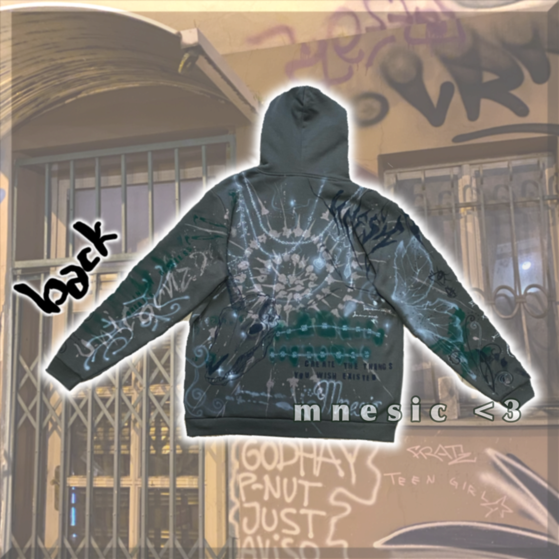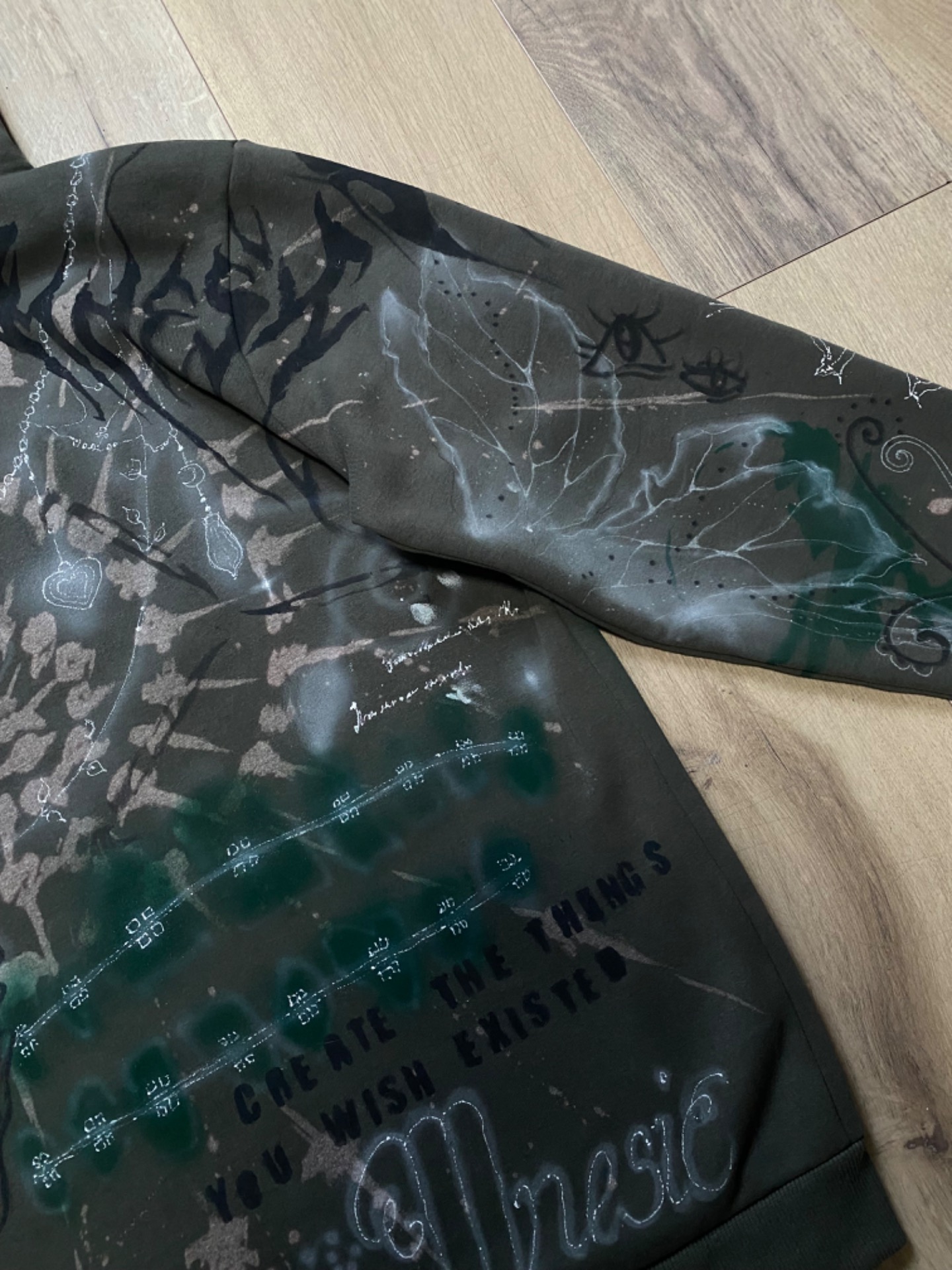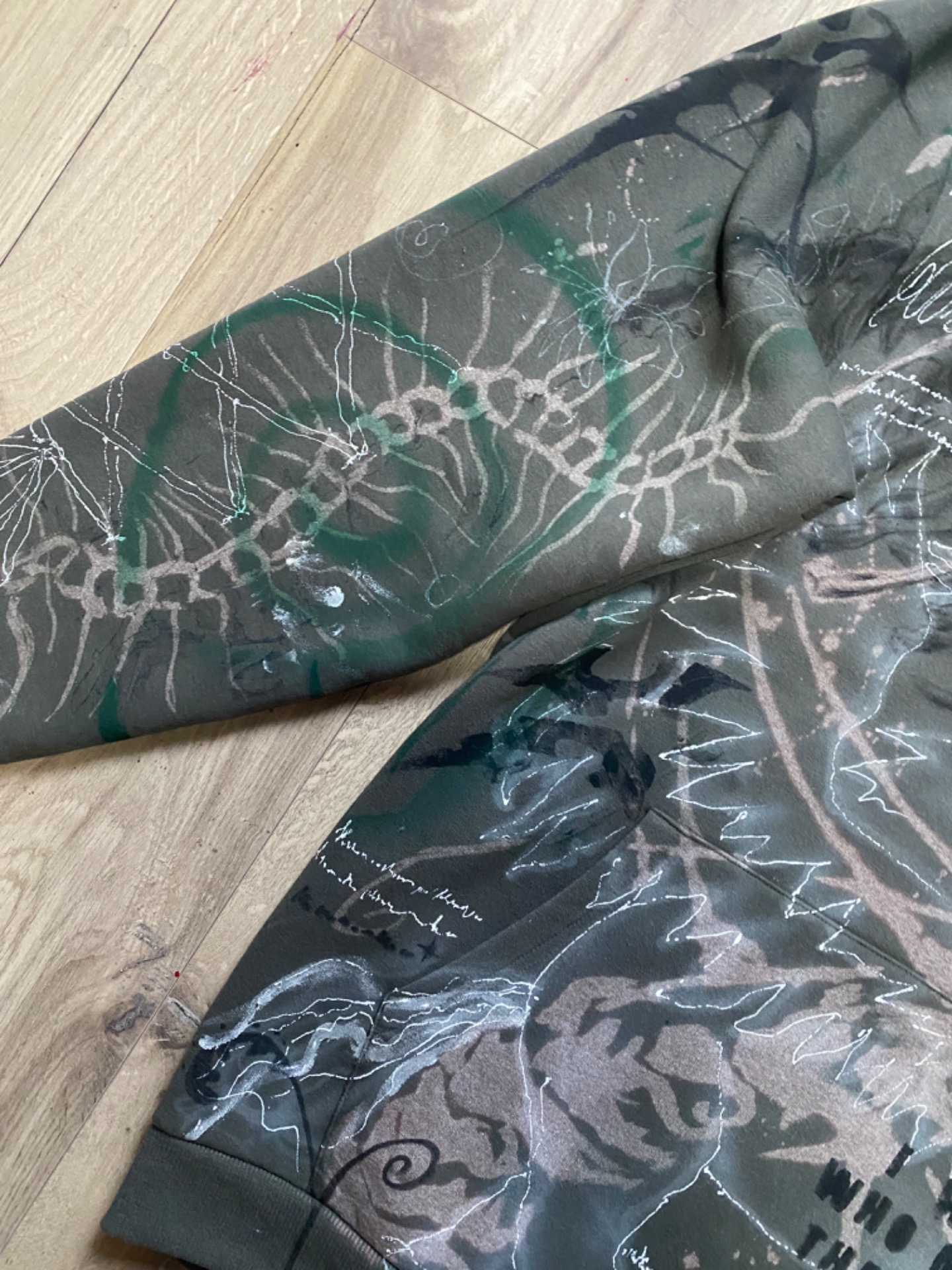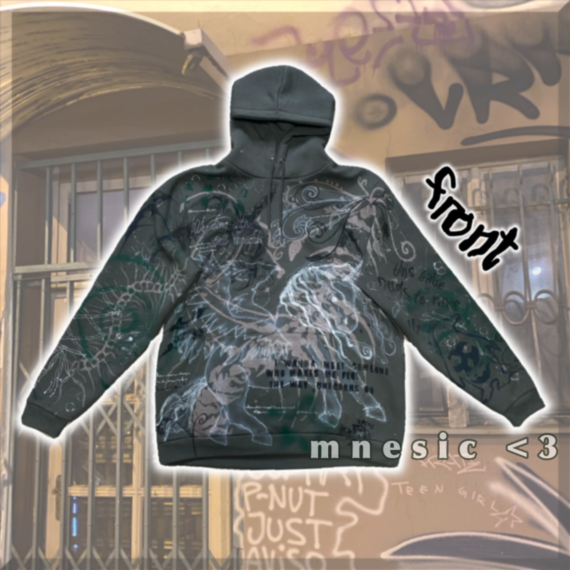Unicornz Hoodie je celá ručně pomalovaná, khaki zelená mikina. Použila jsem na ni savo, barvy na textil, fixy a spreje na textil a airbrush. Jedinečný kus.Velikost XL